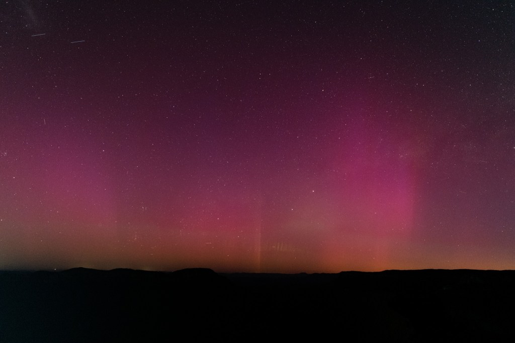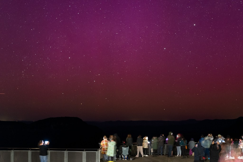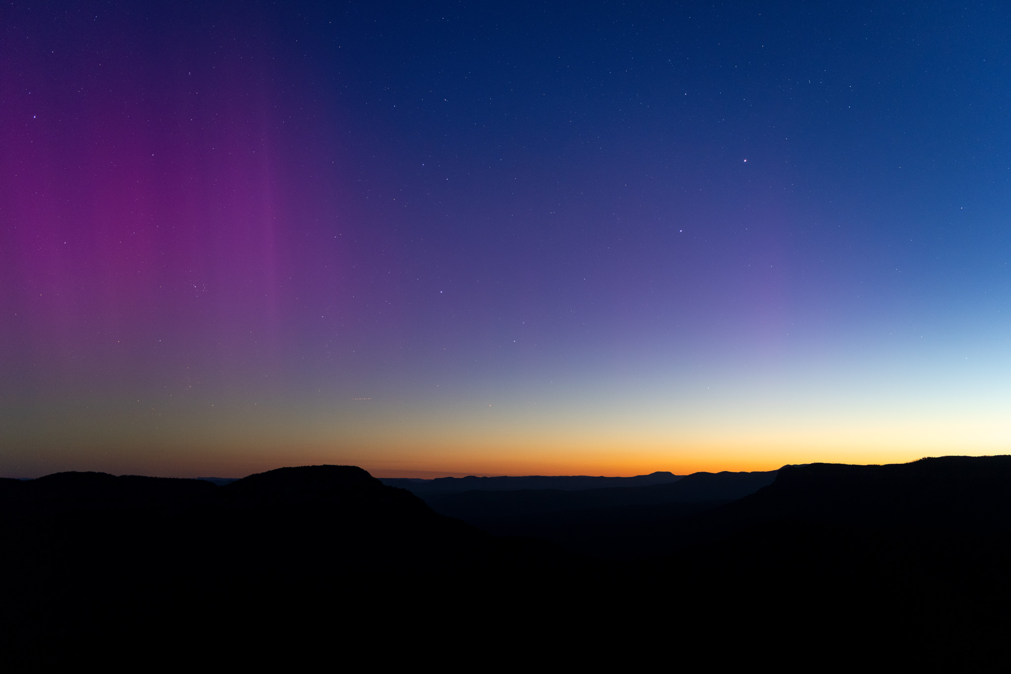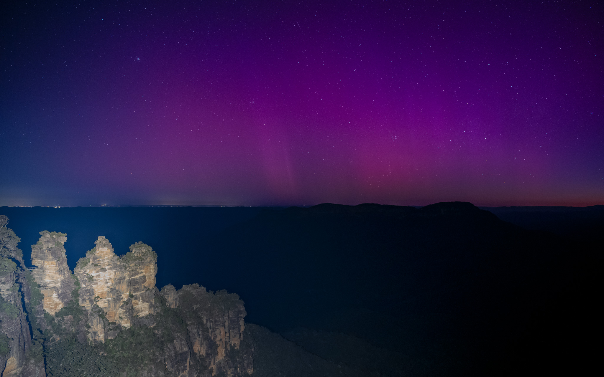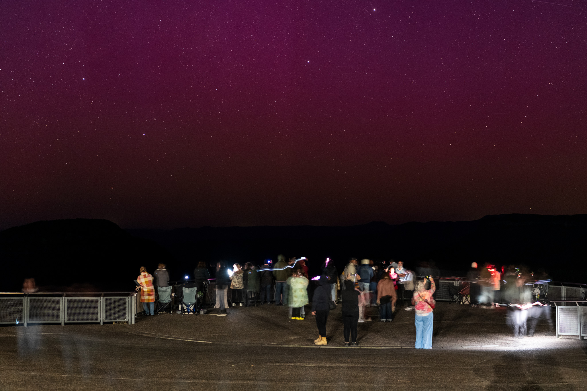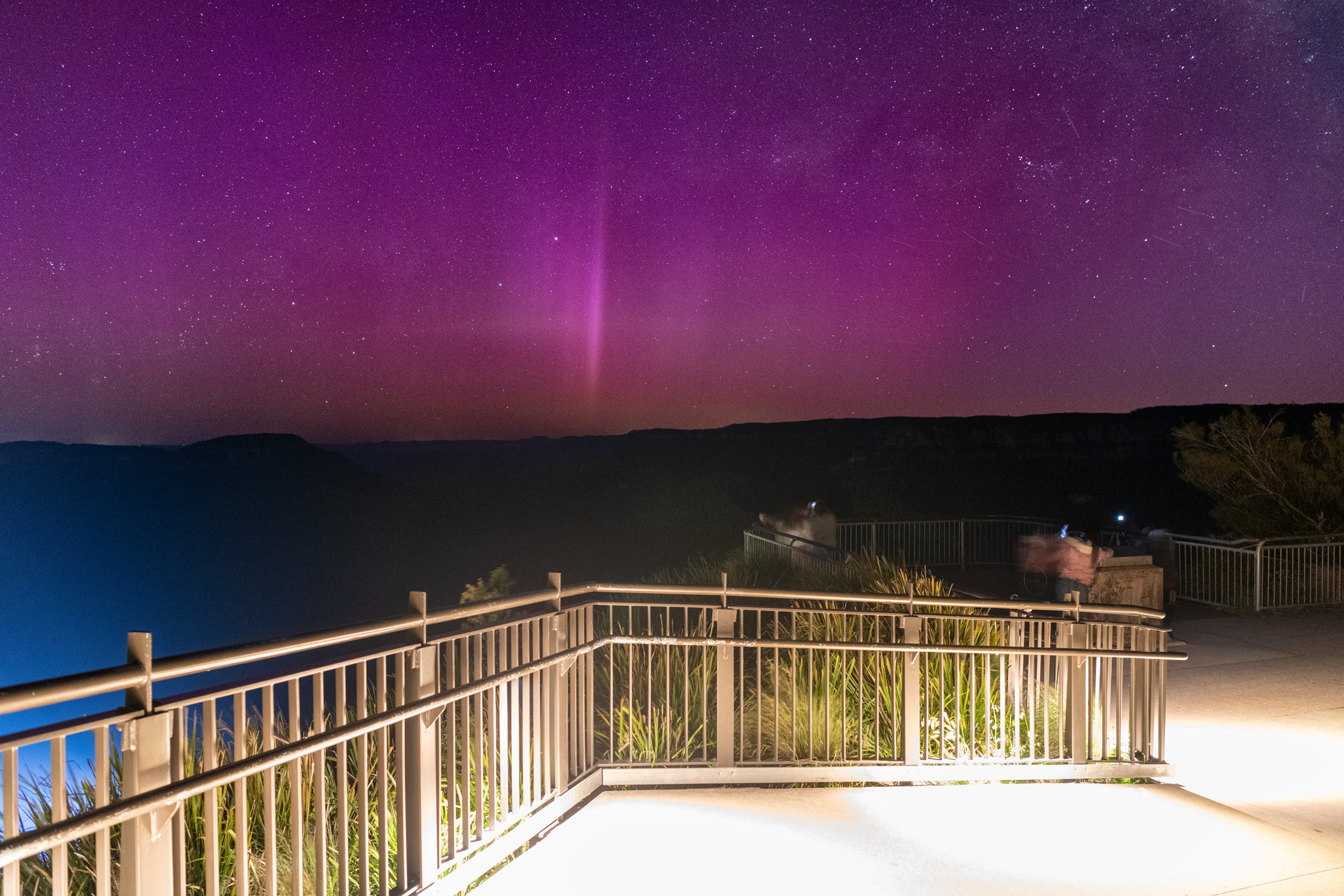 Upon arrival I could see a few people hustling down to the main lookout with tripod in hand eagerly squinting like myself to see if there was any colour in the sky over the jamison valley. Often it’s very hard to see the aurora with the naked eye and it actually isn’t visiable until you capture it with a camera. As I was up my camera on the tripod, a tour guide told me that he had about 25 guests who were going to share the space where I was a part of a star gazing tour. It wasn’t until about 30 minutes later when he look at the images I was capturing, when he excitedly exclaimed, “Oh wait…are you here for an aurora?”. I couldn’t help but give a cheeeky grin and say, “Yep, I thought you guts were too…”, we both laughed and then over the course of the next couple of hours I had a steady stream of onlookers behind me waiting for the long exposures to finish so they could see the aurora on my screen.